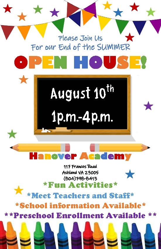 Please Join Us For our End of the Summer Open House! August 10th 1 p.m. – 4 p.m. Hanover Academy 117 Frances Road Ashland VA 23005 (804) 798-8413 Look forward to: Fun Activities Meet Teachers and Staff School Information AvailableRead More